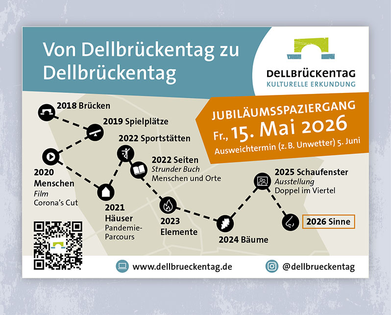 Der Dellbrückentag lädt jährlich an einem Brückentag zur kulturellen Erkundung des Stadtteils ein. Mit dem Konzept „Wir verbinden Orte und Menschen – mit Kultur bewegen!“ organisiert Ingo Müller-Becker seit 2018 das Veedel-Event. Wir durften sowohl Logo als auch Corporate Design entwickeln und freuen uns jedes Jahr auf das Erstellen der neuen Flyer, Plakate und Banner. In diesem Jahr findet der Jubiläumsspaziergang des Dellbrückentags am Freitag, den 15. Mai 2026 statt – mit dem Thema „Von Sinn zu Sinn“.
