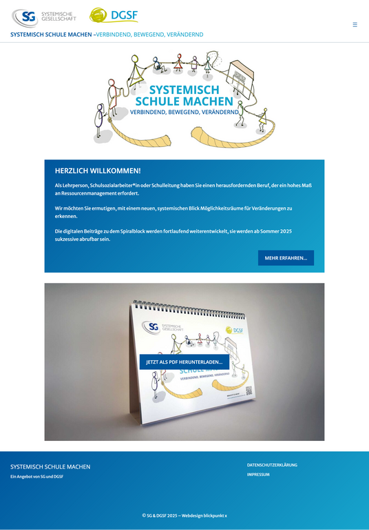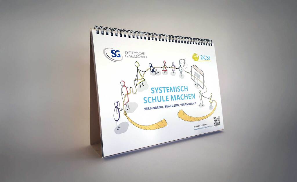 Für ein Kooperationsprojekt zwischen Systemischer Gesellschaft und DGSF konzipierten wir einen Spiralblock als Schreibtischaufsteller für Lehrerzimmer. Zudem gestalteten wir eine Website mit weiterführenden Informationen für Schulen zum Thema. Zur Website führten wir natürlich eine Anwenderschulung durch.